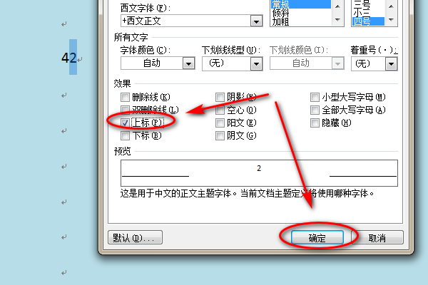 5、在上标前面打√后,点击下方的确定按钮,完成上标效果设置。