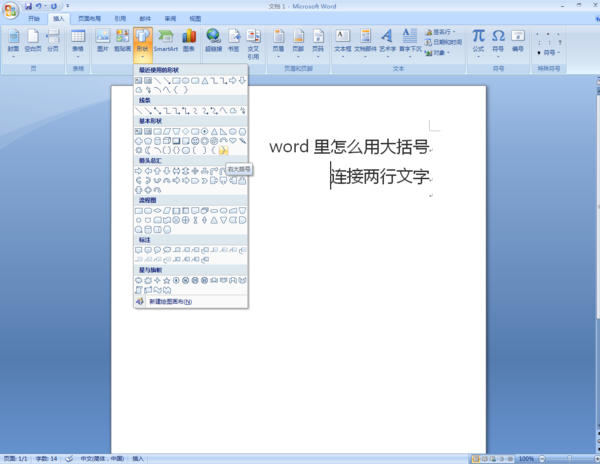 1.打开word后,输入两行文字,点击插入选项下的形状按钮,选择大括号;