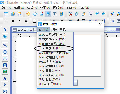 在领跑二维码打印软件上,先新建标签,然后将准备好的 excle txt等外部数据引入到软件中(在设置的时候选择对应的数据库类型)