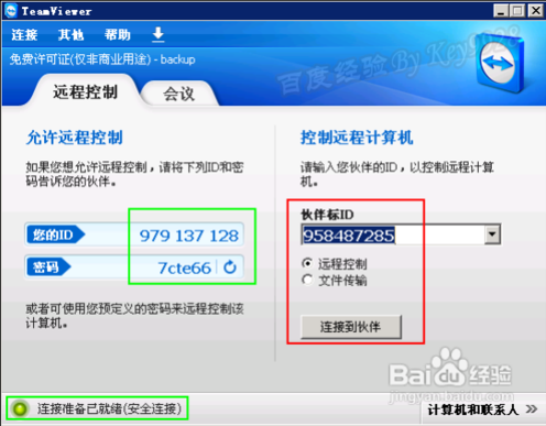 想要控制某一台电子设备时,打开teamviewer,输入想要控制的电子设备的ID号和密码,选择远程控制,再点击连接到伙伴;