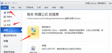 点击打开的文件左上角的文件,找到信息,在右侧会看到一个转换。