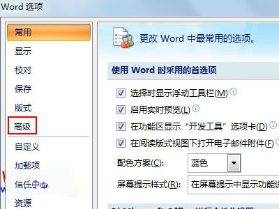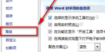 2、在【Word选项】中点击【高级】进入高级选项设置界面。