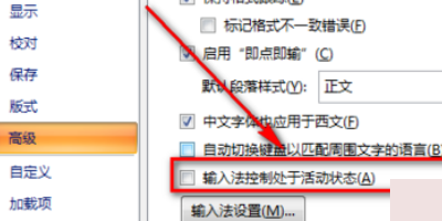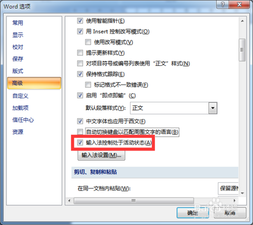 从打开的“Word选项”界面中,切换到“高级”选项卡,勾选“输入法控制处于活动状态”项,点击“确定”完成设置。