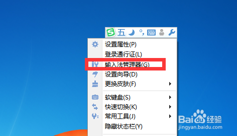 暂时关闭Word程序,或者切换到桌面,右击输入法状态栏,从弹出的右键菜单中选择“输入法管理器”项进入。