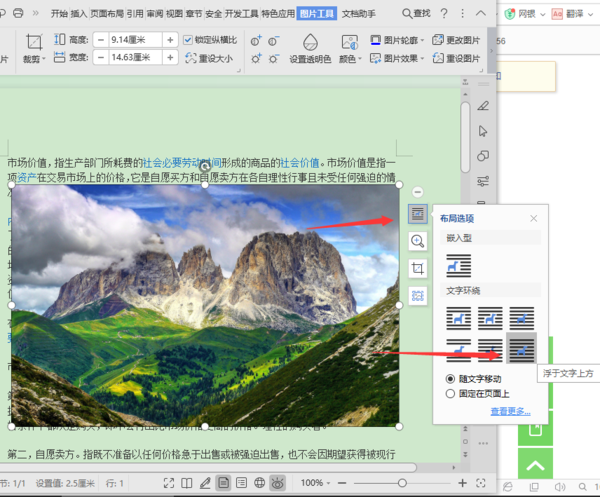 4、接下来有鼠标左键点击图片,选择图片右边的文字选项,选择“浮与文字上方”即可。