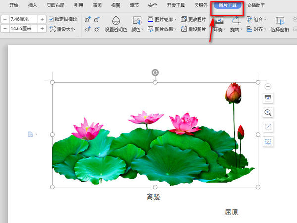 3、插入图片后,然后选中图片,中上方工具栏中选择“图片工具”。