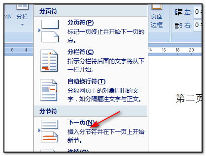 5、点击分隔符以后,在下拉选项中点击分节符的”下一页“的命令;