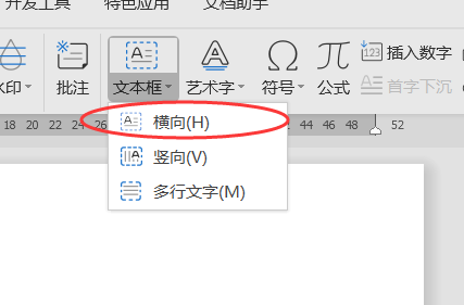 2、在“插入”中找到“文本框”,在下拉框中选择“横向”。