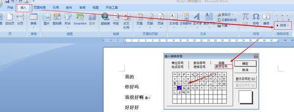 6、点击数学符号选项卡找到对号后然后点击确定按钮,插入了对号;