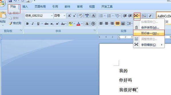 2.选中a√——开始——文字按钮下拉——双行合一,如图: