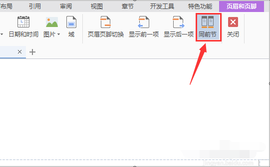 5、在上方的标题栏中,有一选项“同前节”处于选中状态点击取消该状态。