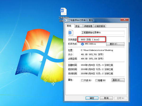 2、在弹出的“属性”里面可以查看到当前的文档为docx格式。