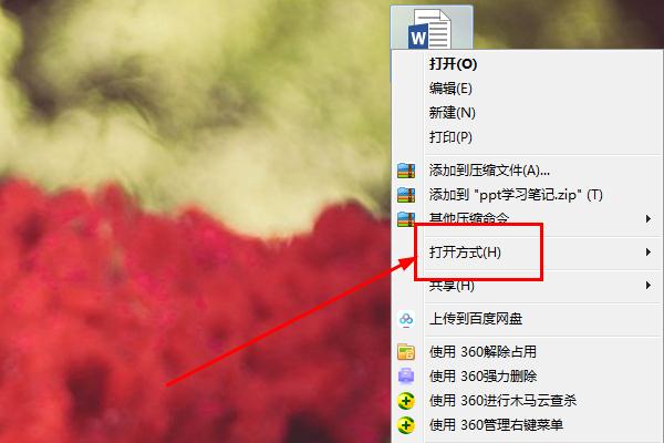 1、新建word文件右键点击打开属性下拉菜单,在下拉菜单中点击点开方式。