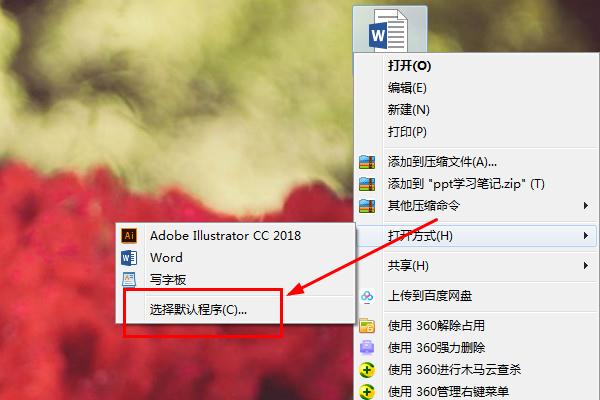 3、在选择默认程序的设置菜单中点击word文档打开方式。