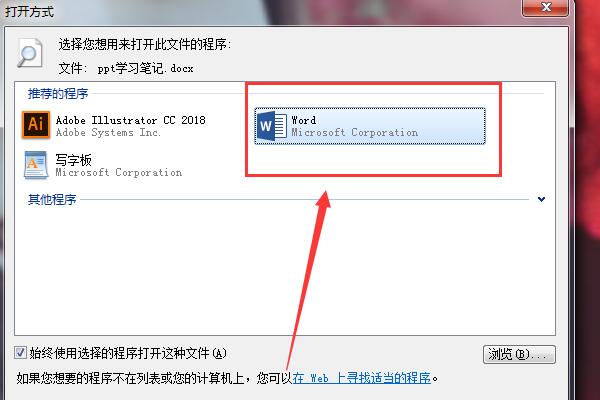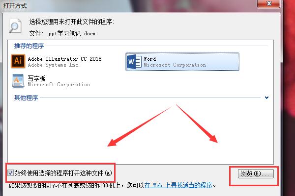 4、选择word打开方式之后点击左下角始终使用选择的程序打开这种文件,之后点击浏览即可。
