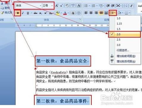 六、选中文字的标题部分(可以按Ctrl键同时单击或者拖拽,选取不同位置的文字),然后单击“开始”,设置文字的大小,字体,和黑体等,然后选择行间距为2.0: