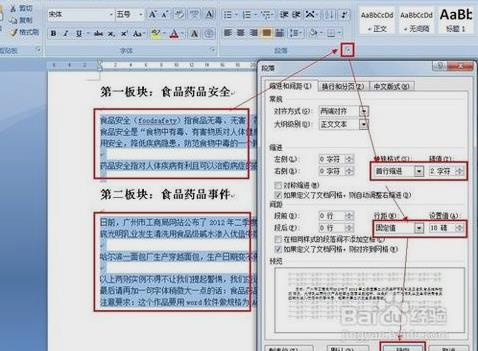七、选中正文部分,然后单击段落栏的右下角图标,设置首行缩进2字符,和固定值为18磅后,单击“确定”: