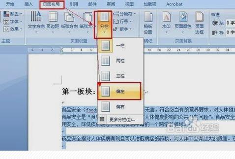 八:选择要分栏的文字,然后依次单击“页面布局,分栏,偏左: