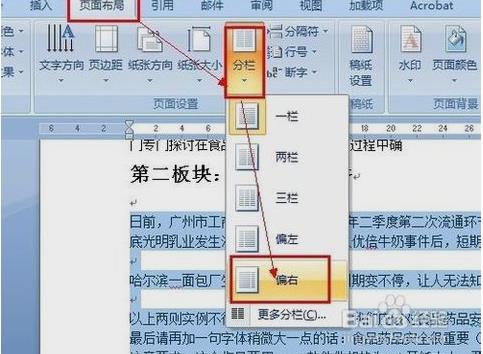 九、将另一部分正文选择“页面布局,分栏,偏右”进行分栏: