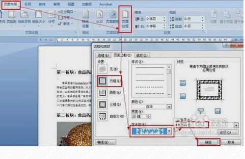 十三、依次单击“页面布局,页面边框”,然后选择“方框”,选择合适的艺术型后,单击“确定”:
