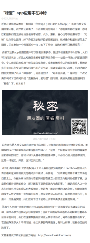 【“秘密”app应用不在神秘】近期在朋友圈有一款叫做“秘密app(现已更名无秘app)”的匿名社交应用非常火爆,我查看了一下这款应用的简介: