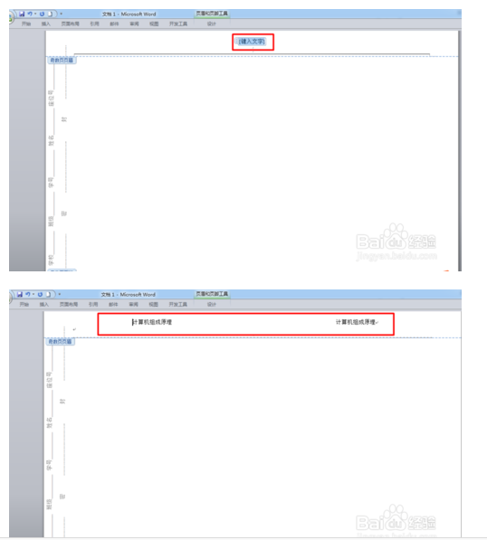 3、编辑页眉,在页眉中加入文字。在"键入文字"中输入所需文字,并在两栏中调整位置,使其合适分布。