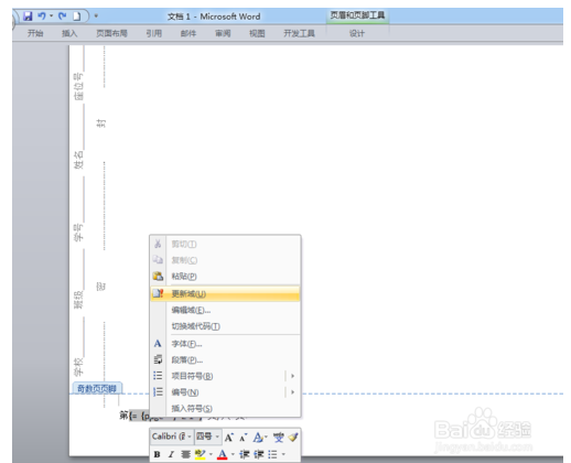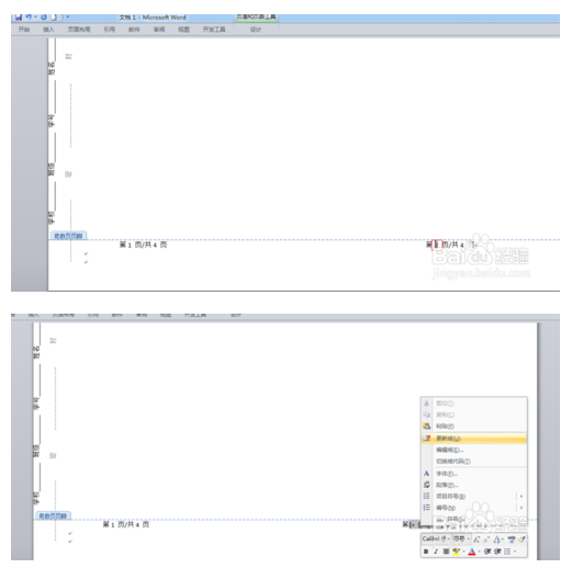 8、选中双大括号并单击右键,选择更新域,将出现页码总数。