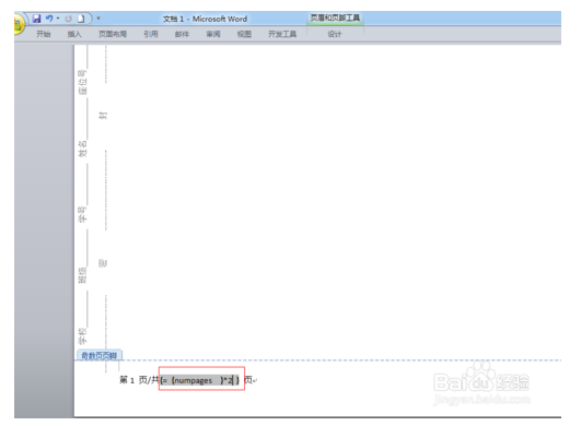 7、对显示总页码数的,操作方法与显示当前页码的大致相似,只是它在大括号中输入的字符与显示当前页码的不同,如下图所示。