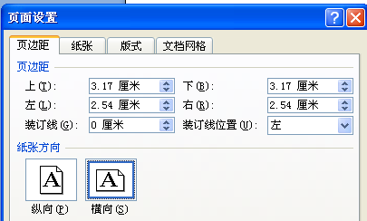 2、弹出页面设置对话框,在页边距选项卡上,选择纸张方向为横向,如图所示;