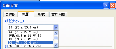 3、选择纸张选项卡,在纸张大小处选择B4,如图所示;