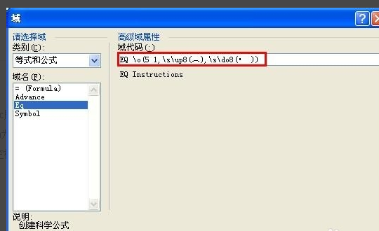 “EQ域”是Word的科学公式编辑功能,能制作许多复杂的数学公式,这里用到EQ域众多开关中的两种:叠加开关和上下标开关。