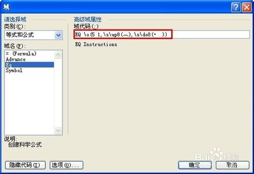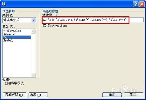 6,域代码内输入:EQ空格\o(5,\s\do10(•),\s\do12(•),\s\do5(—),\s\do7(—))
