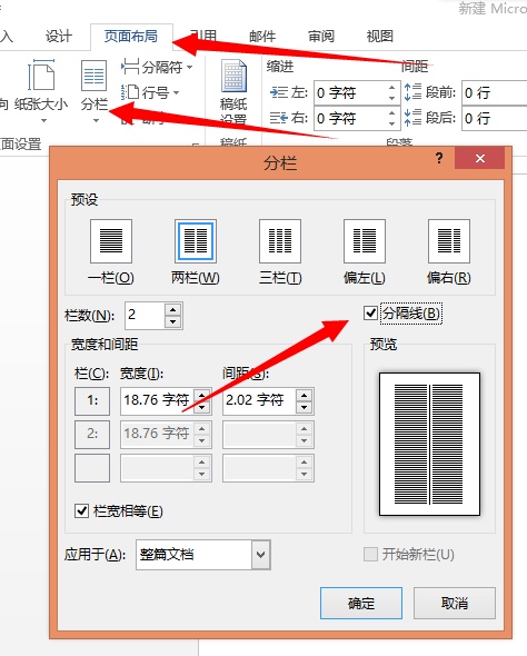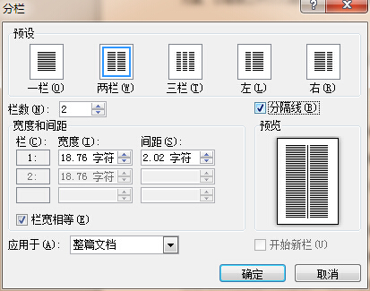 3、选择俩栏即中间一条竖线,根据需要选择即可,勾选分隔线,点击确定;