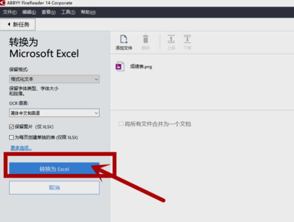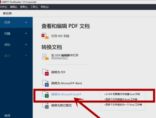 3、进入“ABBYY FineReader 14”软件主界面后,点击“转换为Microsoft Excel”选项,在桌面上找到要转化的图片选中,点击打开。