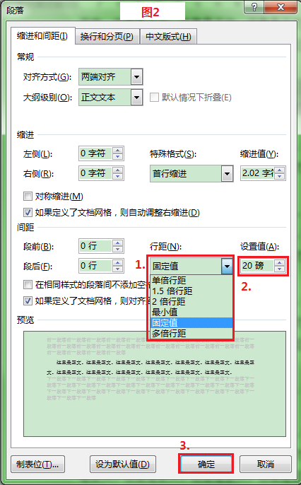 2. 在“段落”对话框的间距区域,“行距”选择“固定值”,其后的“设置值”用上下箭头调整为“20磅”,或直接输入“20磅”。最后“确定”即可(图2)。