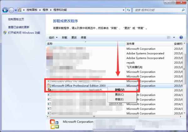 在软件列表里,鼠标右击”microsoft office professional edition 2003“,点击“卸载”即可。