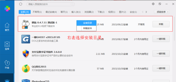 2、使用第三方安全软件(以腾讯管家为例),打开腾讯管家,找到软件管家,选择 软件卸载,软件自动扫描后即可看到电脑所安装的大部分软件,右击想查看的软件,有个“安装目录” 选项,点击即可查看。