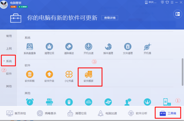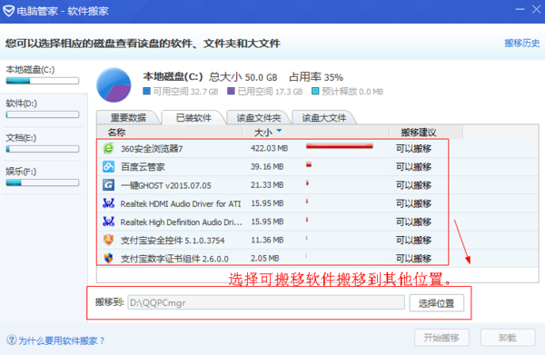 2、如果是C盘软件移动,可以使用其他辅助软件,例如腾讯管家里的软件搬家。如图所示: