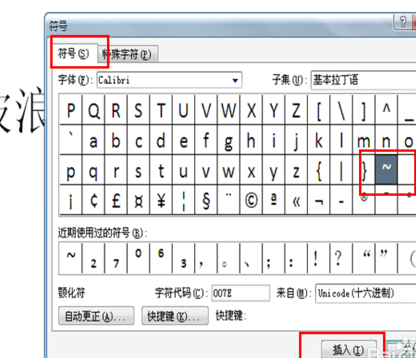 方法二、将鼠标定位在需要输入波浪号的地方,选择“插入”菜单中的“符号”,点向下箭头,选择“其他符号”。在弹出的特殊符号对话框中找到波浪号,直接点插入便可完成,直接就是居中的。