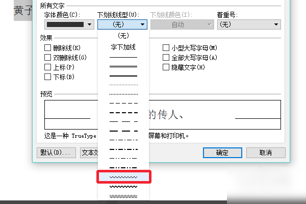 4.在“所有文字”选项区域中的“下划线线型”中选择“波浪线”线型,(如果你要设置它的颜色的话,可在旁边的“下划线颜色”中单击你所想要的颜色)