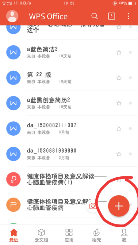 2、下载完毕后打开wps,准备新建word。点击页面最下面的“+”图标,进入新建页面。出现新建页面后,点击“文字”图标。