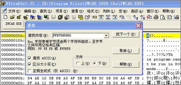 下个中望CAD,使用编辑软件ultraedit-32打开ZWCAD.EXE主文件,然后搜索FFD7595950,找到后将50改为51保存