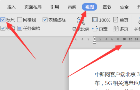2、点击标题栏“视图”按钮,然后勾选“标尺”,则文档上部出现标尺标志。
