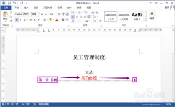 4、然后,就可以编辑目录内容。在行首输入一级目录内容,通过Tab键输入前导符的同时将光标定位到页码位置。输入页码后,回车。此处我们可以看到,前导符形状为之前设置的形状。