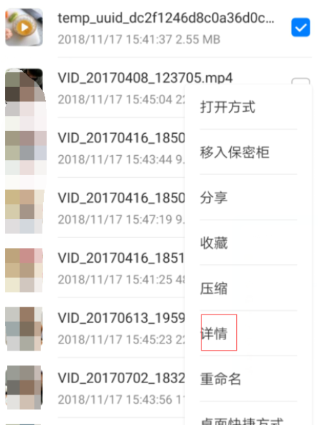 6.长按其中的一个视频,选择右下角的更多菜单,然后点击详情就可以选择查看每一个视频的详细信息