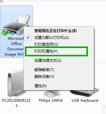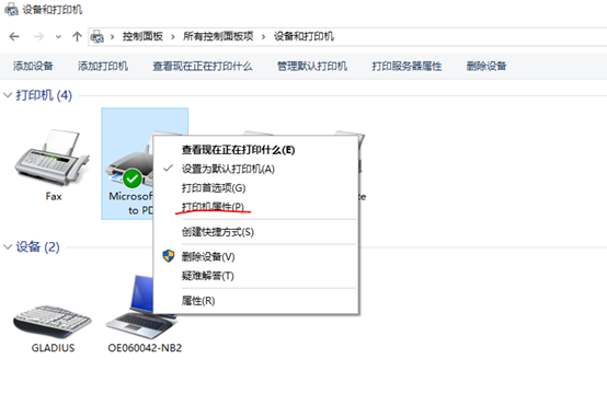 打开“设备和打印机”。找到打印机并对其鼠标右键,选择打印机属性。