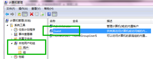 选择“本地用户和组”的Guest账户。