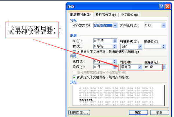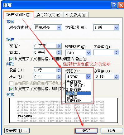 说明:“固定值”的意思是永远保持设定的行距不变,“最小值”在字体较大而行距较小时会自动调整,将文字全部显示出来。