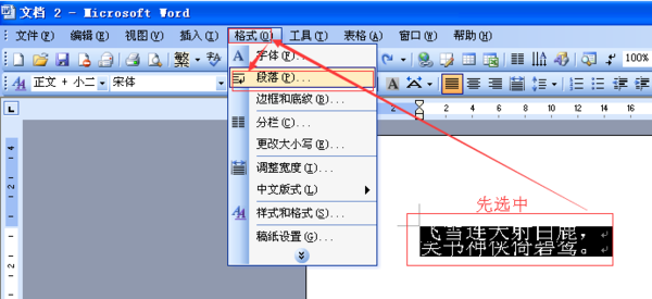 1、先选中文字,点击菜单中“格式”下的“段落”;
