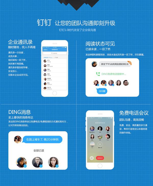 钉钉主要是针对中小企业用户,其特色在于消息已读未读一目了然,DING电话使命必达,免费电话多方通话,企业通讯录随时随地找人,多端互动。